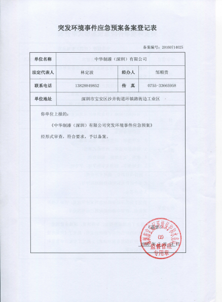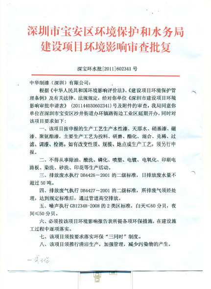 中華制漆(深圳)有限公司于1991年設(shè)立,組織機構(gòu)代碼61882250-8,法定代表人林舒,企業(yè)聯(lián)系電話0755-33658888。工廠位于深圳市寶安區(qū)沙井鎮(zhèn)衙邊工業(yè)區(qū),占地面積58,000㎡,于1993年底建成全面投產(chǎn)。產(chǎn)品包括各類優(yōu)質(zhì)建筑涂料、保養(yǎng)性涂料、地板涂料、木器涂料及玩具、電子制品涂料等,屬于危險化學(xué)品企業(yè)?,F(xiàn)有員工480人,其中安全管理人員、工程技術(shù)人員、行政管理人員180余人。