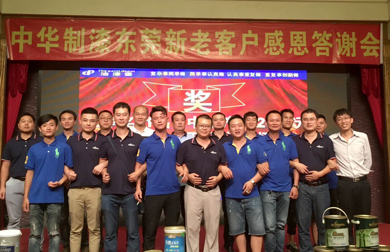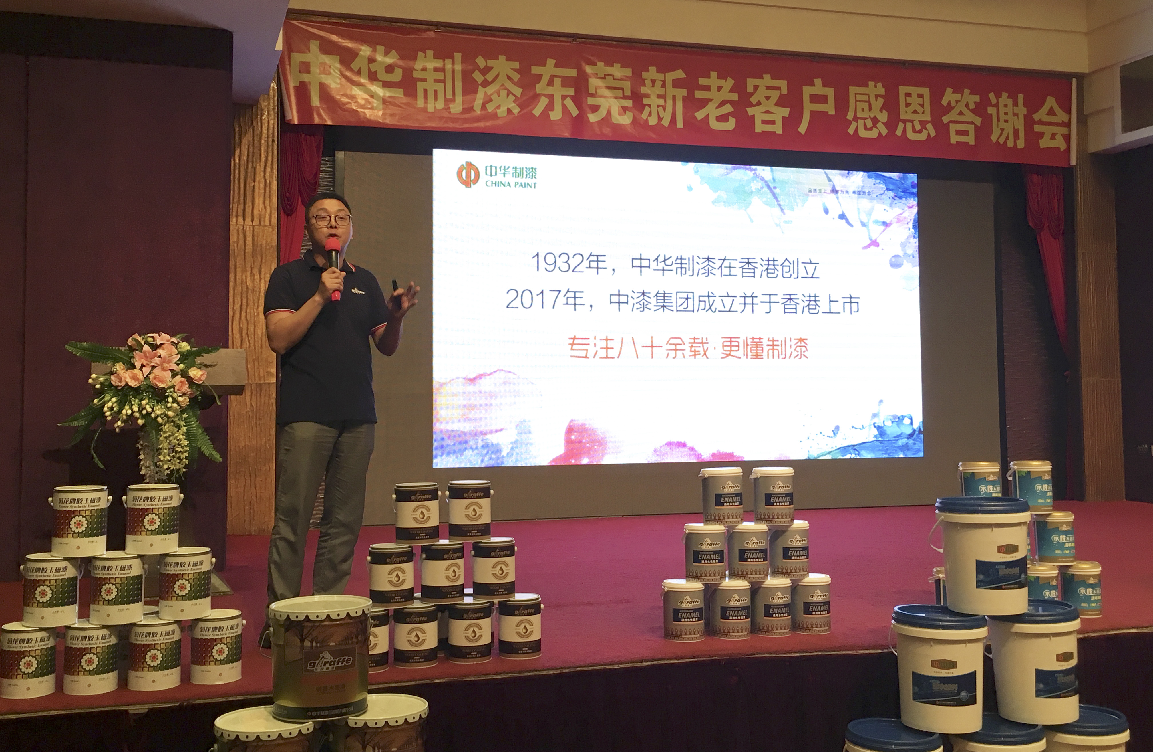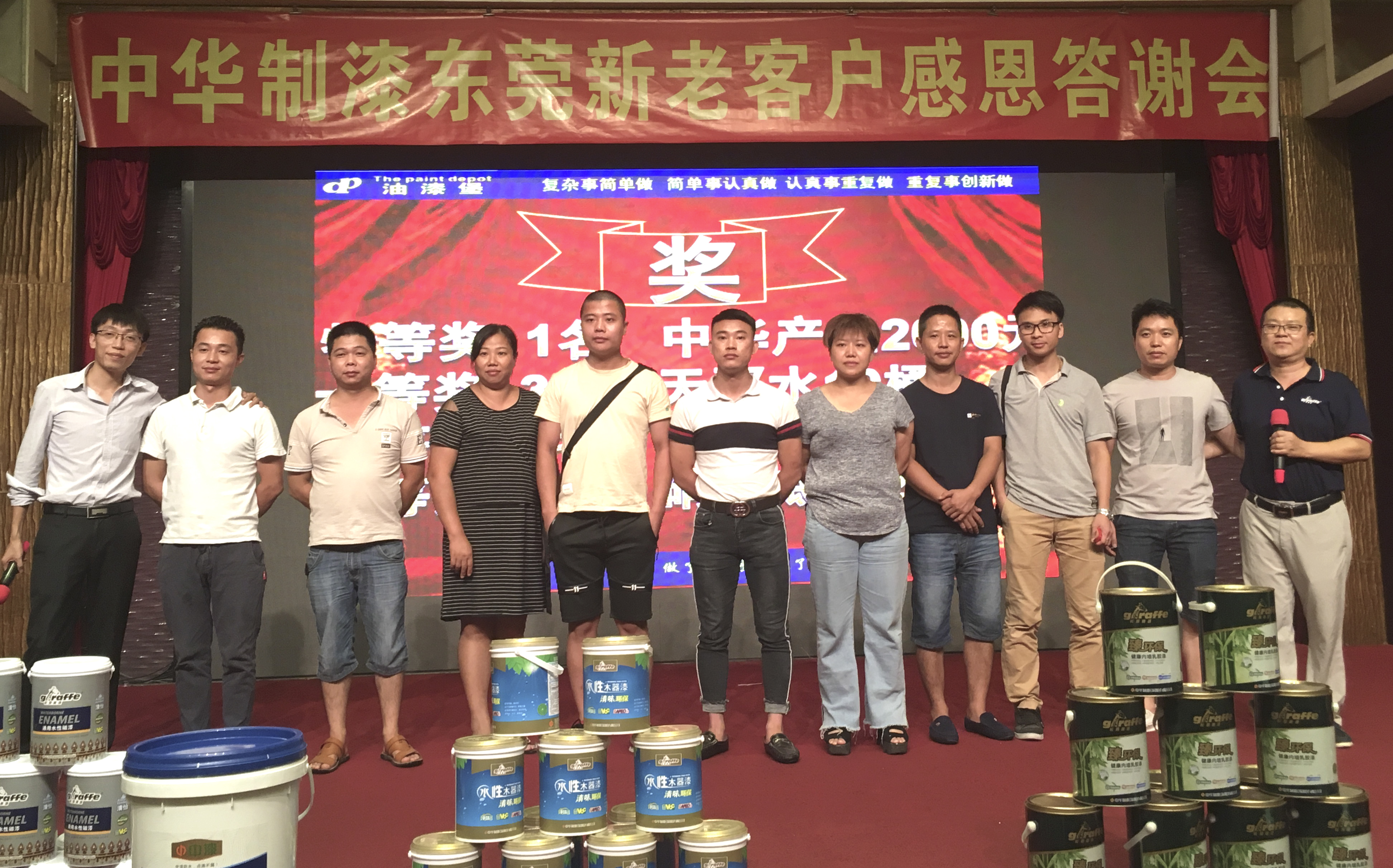 2018年7月12日,中華制漆(深圳)有限公司聯(lián)合深圳油漆堡建材實(shí)業(yè)有限公司,在東莞市東城國(guó)際大酒店召開(kāi)東莞地區(qū)新老客戶感恩答謝會(huì)。中華制漆深圳營(yíng)業(yè)部林和順先生、曾鵬先生及技術(shù)服務(wù)部盧國(guó)強(qiáng)先生參加了此次答謝會(huì)。