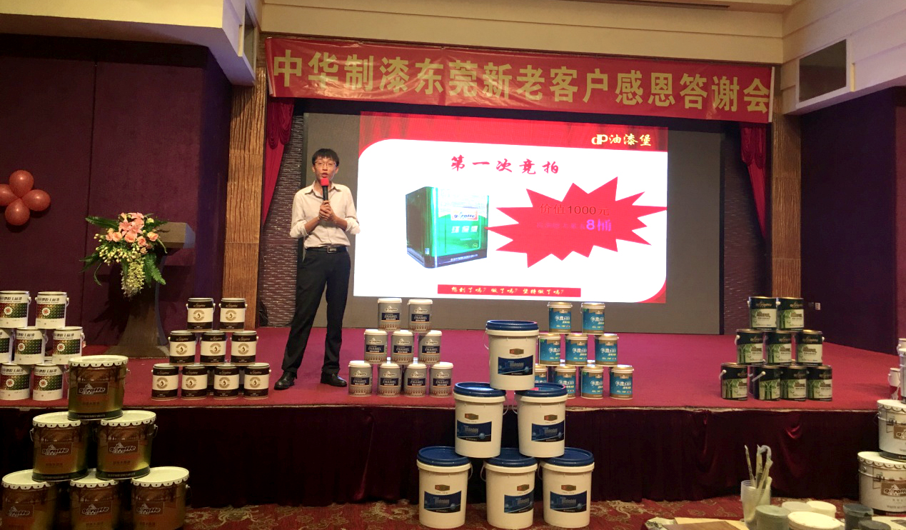 在答謝晚宴前,中華制漆技術(shù)服務(wù)部盧國(guó)強(qiáng)先生在現(xiàn)場(chǎng)為前來(lái)參加本次活動(dòng)的東莞地區(qū)約160位經(jīng)銷商朋友作了中華制漆產(chǎn)品線介紹及現(xiàn)場(chǎng)施工應(yīng)用互動(dòng)。特別針對(duì)水性木器漆、水性磁漆、聚合物防水涂料、臻環(huán)保乳膠漆等中漆新產(chǎn)品進(jìn)行重點(diǎn)推廣,對(duì)產(chǎn)品性能、施工特點(diǎn)與到場(chǎng)的各位客戶一起交流,同時(shí)通過(guò)演示,展示了產(chǎn)品的優(yōu)良性能。
