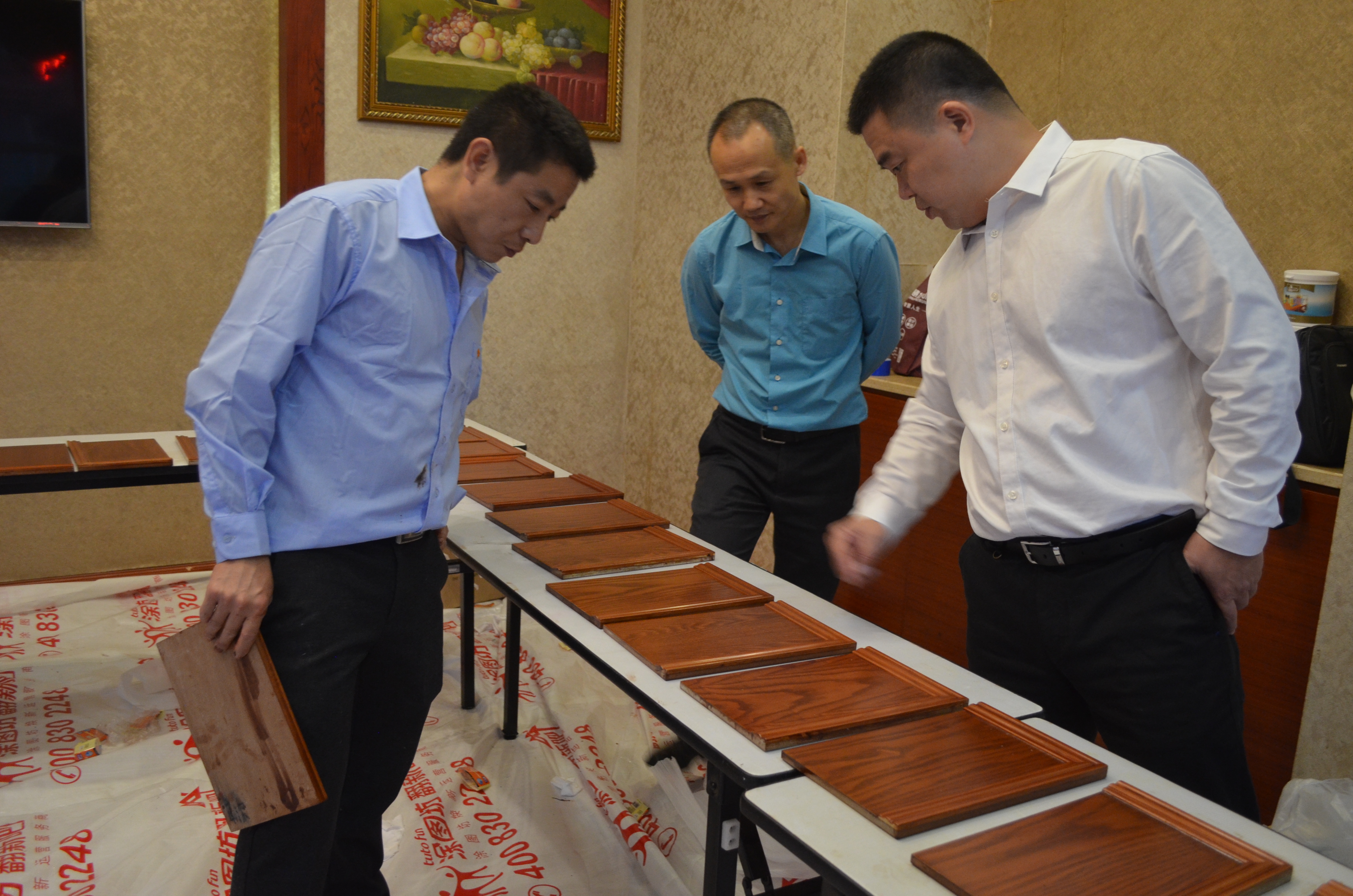 80塊成品整齊擺放,評委們針對不同角度的呈現(xiàn)效果,層層篩選,根據(jù)成品的顏色效果、漆膜效果、樣板整潔度進(jìn)行評比。