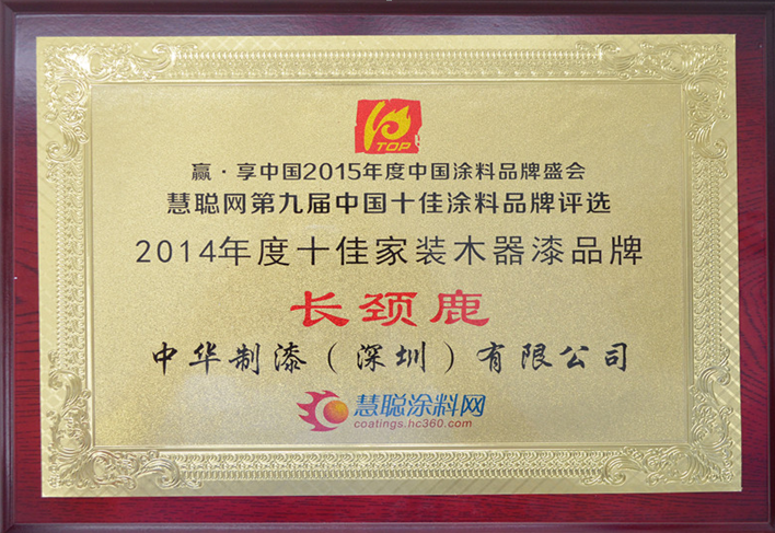 2015年7月7日,由慧聰網(wǎng)主辦的“贏享中國——2015中國涂料品牌盛會暨慧聰網(wǎng)第九屆中國十佳涂料品牌評選頒獎盛典”,在廣州白云國際會議中心隆重召開。中華制漆長頸鹿漆再度榮獲“十佳家裝木器漆品牌”殊榮。