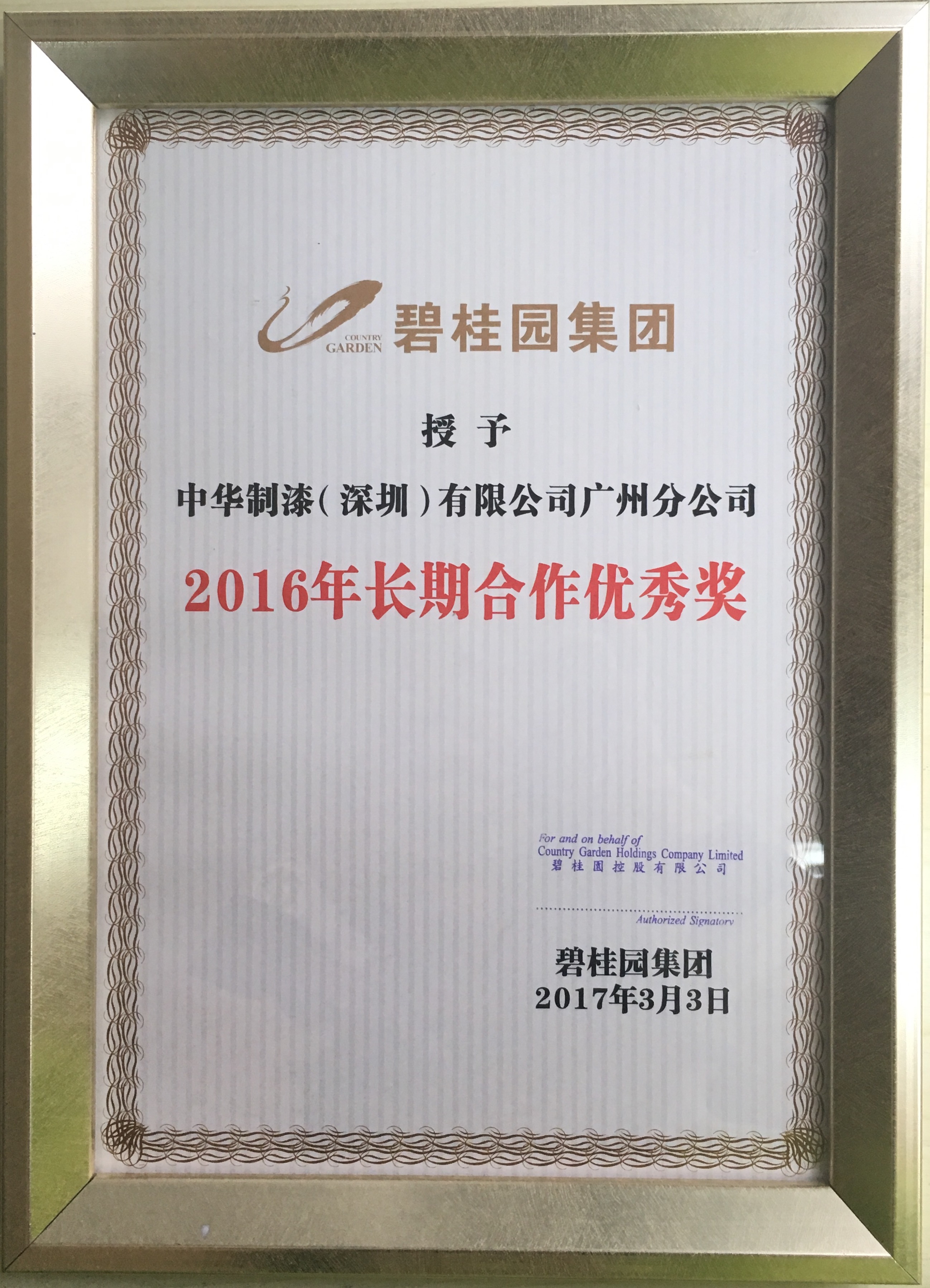 值得高興的是,中華制漆憑借過硬的產(chǎn)品品質(zhì)和專業(yè)高效的服務(wù),喜獲碧桂園集團(tuán)頒發(fā)的“2016年長期合作優(yōu)秀獎”!