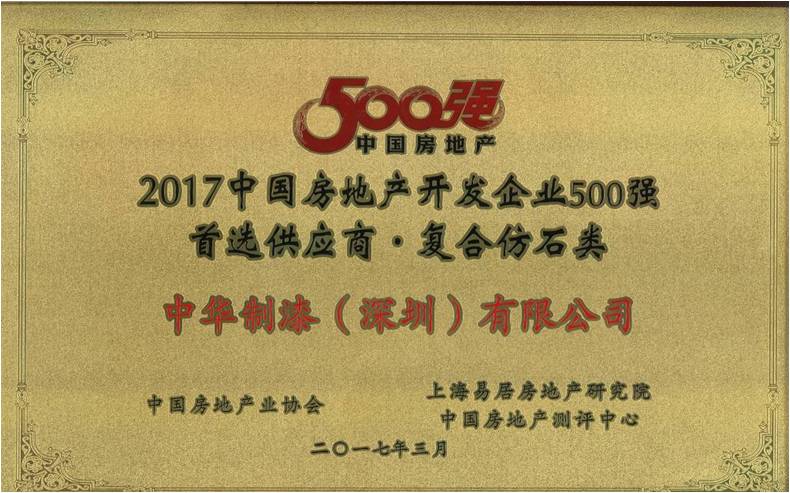 2017年3月22日,中國房地產(chǎn)500強測評成果發(fā)布會暨500強峰會在北京國貿(mào)大酒店盛大開幕,會上隆重揭曉了《2017中國房地產(chǎn)開發(fā)企業(yè)500強首選供應(yīng)商服務(wù)商品牌測評報告》。本屆活動吸引了房地產(chǎn)開發(fā)企業(yè)、服務(wù)商、供應(yīng)商以及媒體代表等近500人出席。憑借卓越的產(chǎn)品品質(zhì)、效果和完善的服務(wù)能力,中華制漆榮獲“中國房地產(chǎn)500強首選供應(yīng)商品牌·復(fù)合仿石類”獎項。