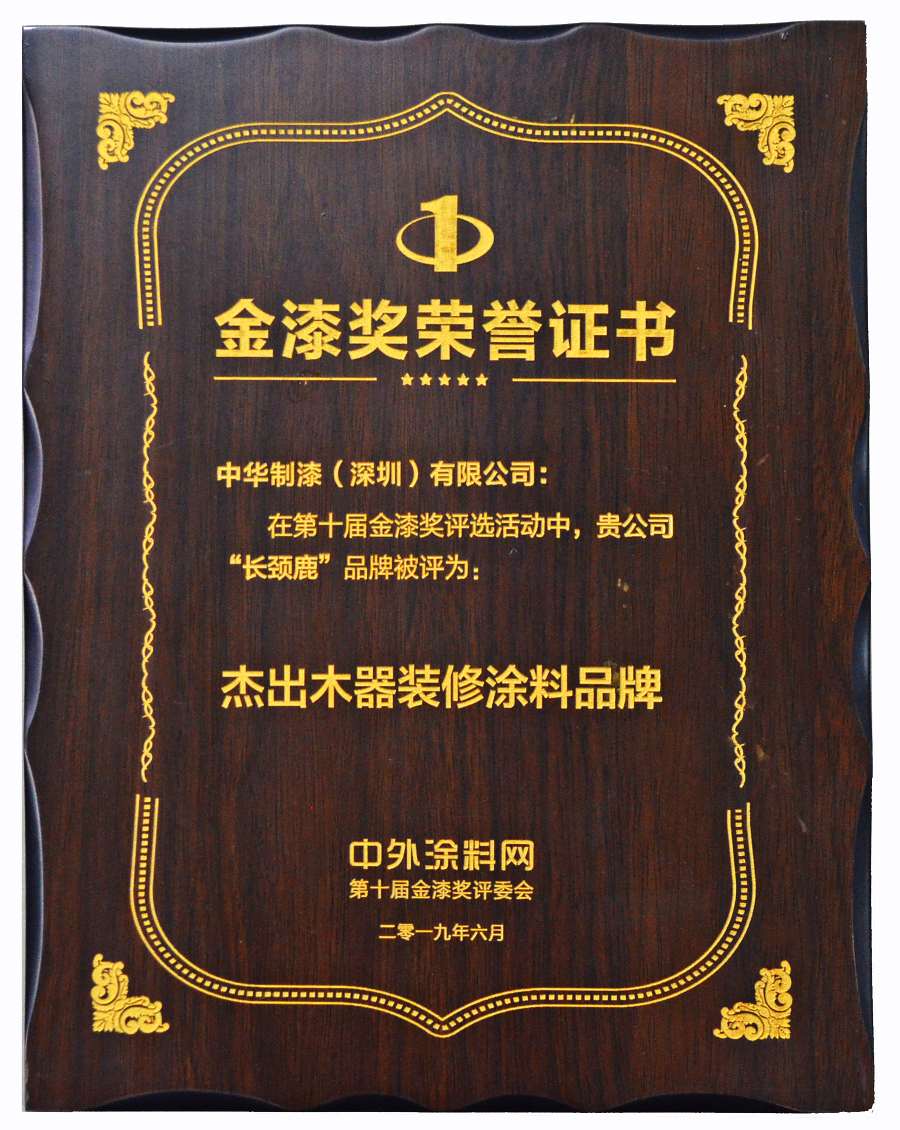 2019年6月3日,中國(guó)第十屆金漆獎(jiǎng)?lì)C獎(jiǎng)盛典在“中國(guó)涂料之鄉(xiāng)”佛山順德隆重舉行,中華制漆旗下長(zhǎng)頸鹿漆品牌斬獲第十屆金漆獎(jiǎng)“杰出木器裝修涂料品牌”獎(jiǎng)項(xiàng),中華制漆市場(chǎng)部高級(jí)經(jīng)理王立東先生受邀出席盛典。