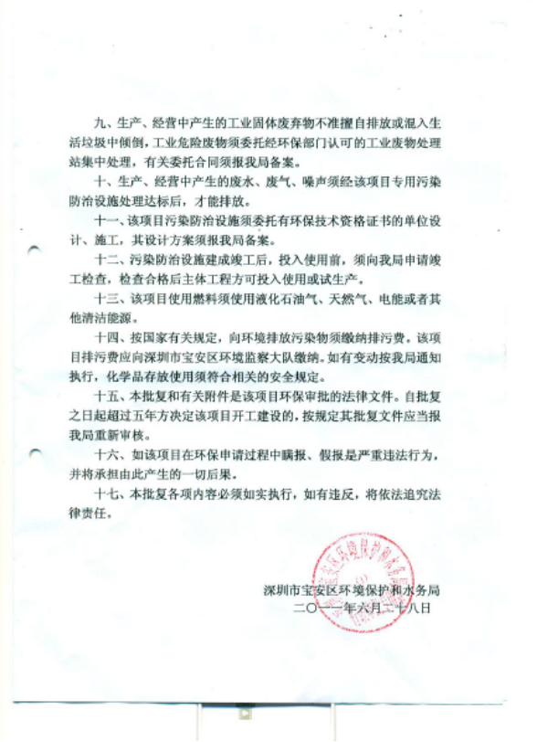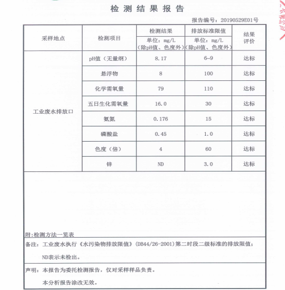 公司通過ISO 9001質(zhì)量管理體系、ISO 14001環(huán)境管理體系、IECQ-QC080000有害物質(zhì)過程管理體系、OHSAS 18001職業(yè)健康安全管理體系認(rèn)證。根據(jù)公司產(chǎn)品性質(zhì),公司廢水處理采用活性污泥法連續(xù)性處理廢水。自1993年10月份投資近百萬元興建的污水處理站項(xiàng)目正常運(yùn)行以來,日處理能力達(dá)50噸,達(dá)到國家二級排放標(biāo)準(zhǔn)水污染物排放限值(DB4426-2001);公司于2016年投入30多萬對廢水處理系統(tǒng)進(jìn)行升級維護(hù),保證了廢水的處理持續(xù)穩(wěn)定達(dá)標(biāo)。