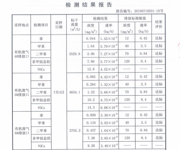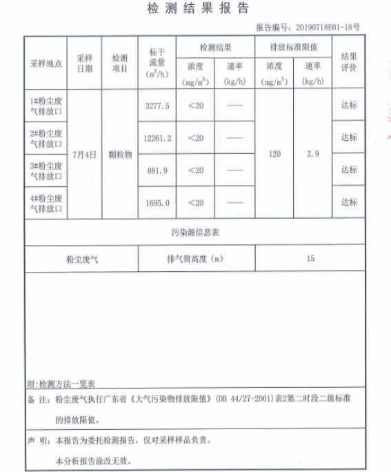 (2)排放方式及排放口:公司共6個廢氣排放口,廢氣經(jīng)吸氣罩、風(fēng)管、活性炭水噴淋、UV光解機(jī)處理設(shè)施處理達(dá)標(biāo)后高空排放。