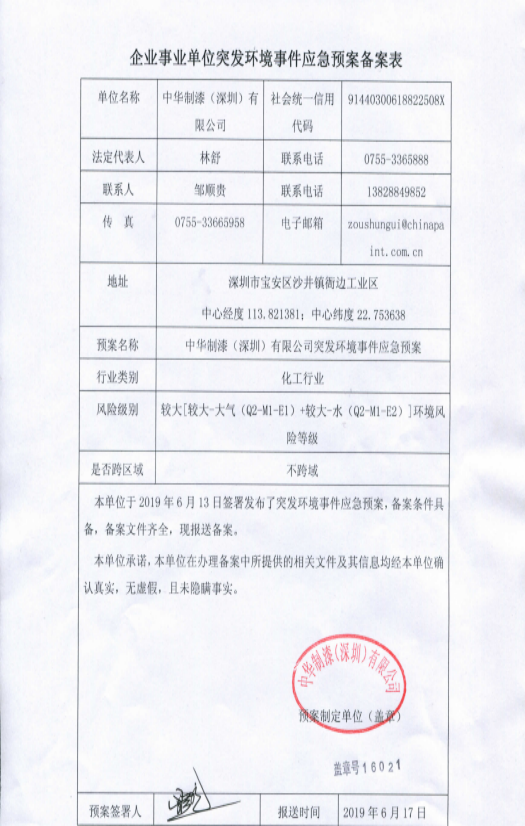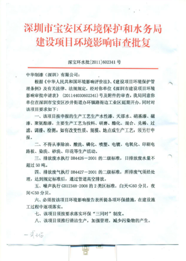 中華制漆(深圳)有限公司于1991年設(shè)立,統(tǒng)一社會信用代碼91440300618822508X,法定代表人林舒,企業(yè)聯(lián)系電話0755-33658888。工廠位于深圳市寶安區(qū)沙井鎮(zhèn)衙邊工業(yè)區(qū),占地面積58,000㎡,于1993年底建成全面投產(chǎn)。產(chǎn)品包括各類優(yōu)質(zhì)建筑涂料、保養(yǎng)性涂料、地板涂料、木器涂料及玩具涂料等,屬于危險化學(xué)品企業(yè)?,F(xiàn)有員工402人,其中安全管理人員、工程技術(shù)人員、行政管理人員180余人。