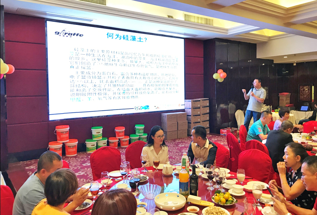 學(xué)無(wú)止境,本次大會(huì)特意邀請(qǐng)專(zhuān)家授課,講解長(zhǎng)頸鹿漆熱門(mén)的水性產(chǎn)品,為大家提供自我增值的機(jī)會(huì),希望給大家?guī)?lái)新的啟發(fā)。中華制漆技術(shù)服務(wù)部經(jīng)理盧國(guó)強(qiáng)先生逐一認(rèn)真地為大家講解了長(zhǎng)頸鹿牌凈味120硅藻竹炭全效內(nèi)墻乳膠漆、凈味M600內(nèi)墻漆、內(nèi)墻膩?zhàn)印兹槟z、幻麗彩K11防水漿料,對(duì)其功能賣(mài)點(diǎn)等均進(jìn)行了詳細(xì)的介紹,為嘉賓們拓展了知識(shí)面。大家全神貫注地聆聽(tīng),獲益匪淺。