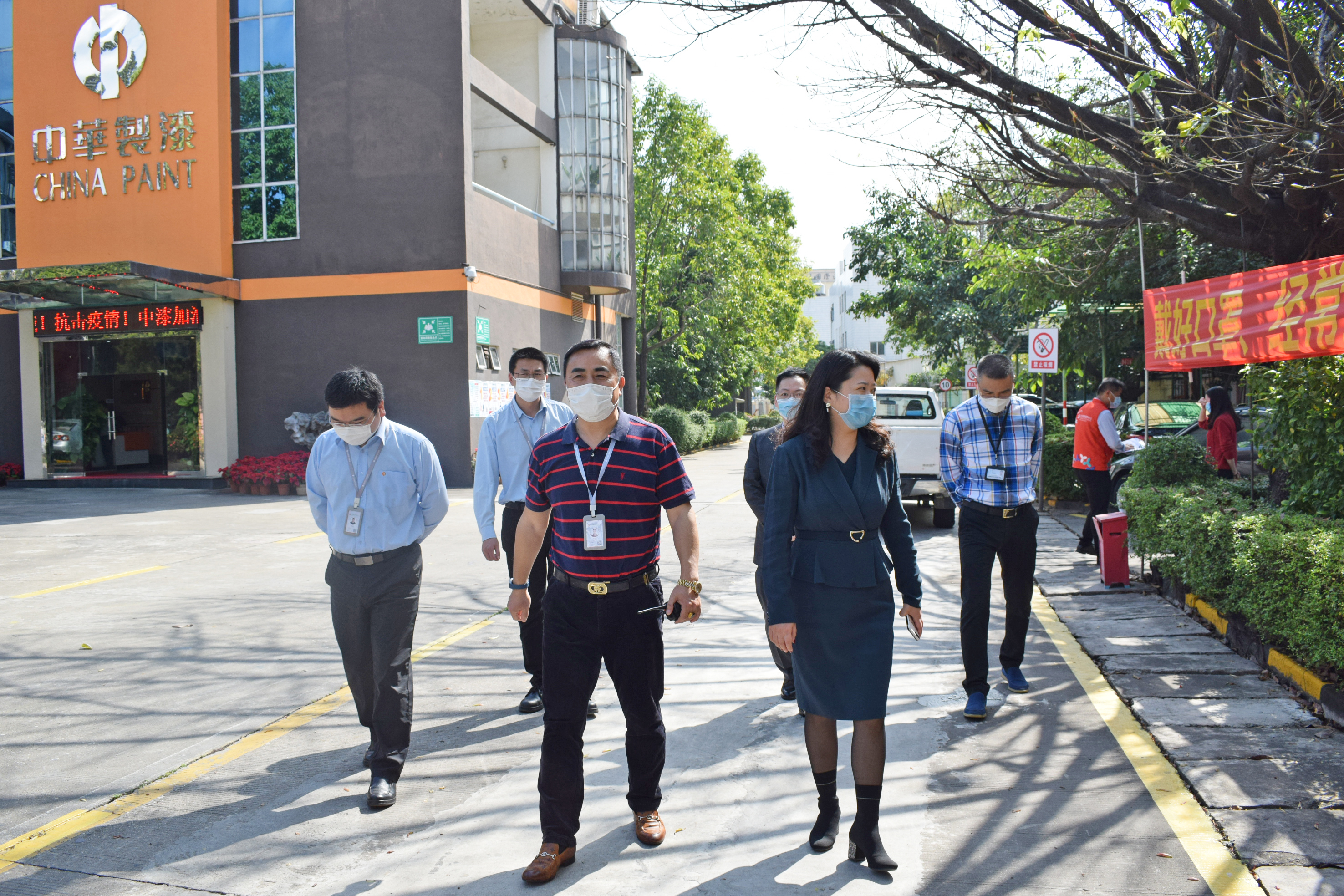 2020年2月26日上午,深圳市寶安區(qū)沙井街道辦主任王凌云、經(jīng)科辦主任陳麗芬、衙邊社區(qū)工作站書記陳志賢等領(lǐng)導(dǎo)一行蒞臨中華制漆走訪慰問,就防疫抗疫期間公司生產(chǎn)運(yùn)營(yíng)、員工健康安全防護(hù)等具體狀況進(jìn)行了深入了解。中華制漆執(zhí)行委員會(huì)代表王詩(shī)遠(yuǎn)、生產(chǎn)運(yùn)營(yíng)部總經(jīng)理曹華龍、人力資源部總監(jiān)王繼鋒熱情進(jìn)行了接待。