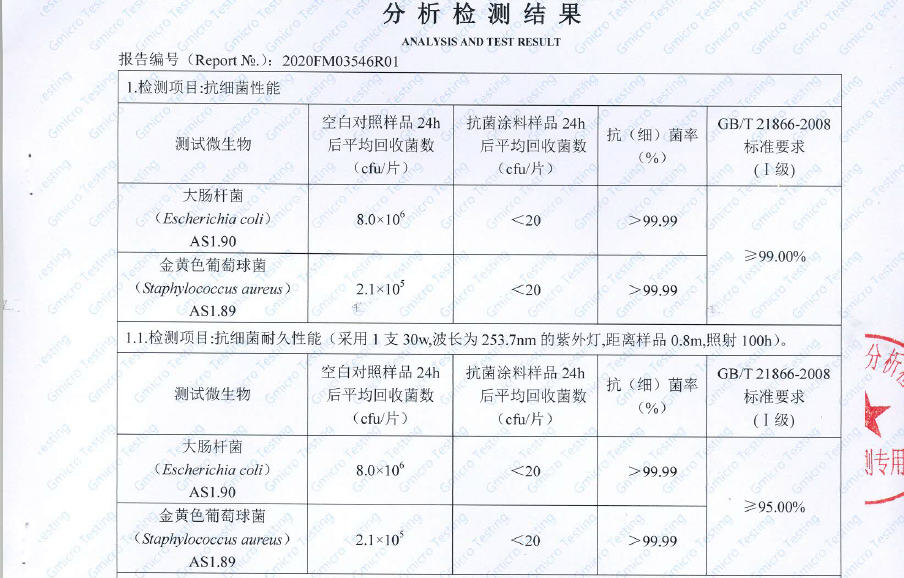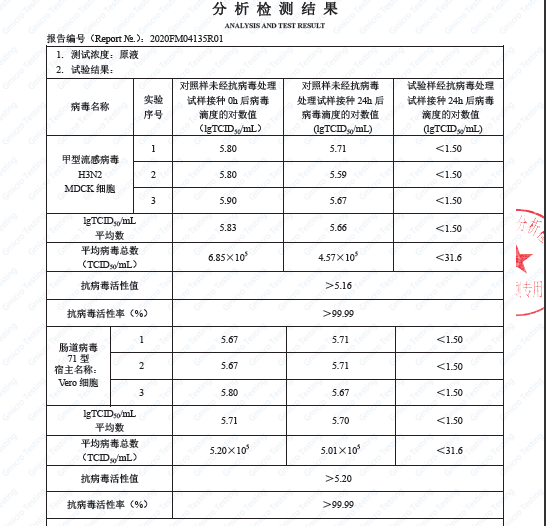 經(jīng)國內(nèi)權(quán)威微生物檢測機(jī)構(gòu)分別對(duì)產(chǎn)品抗病毒性能和抗菌性能進(jìn)行了嚴(yán)苛檢測,其實(shí)驗(yàn)數(shù)據(jù)表明,臻天然抗病毒無機(jī)礦物涂料對(duì)甲型流感病毒(H3N2)、腸道病毒71型(引起手足口病的一種病毒)、大腸桿菌、金黃色葡萄球菌等病菌具有99.99%的超高滅活率,屬于可檢測的最高級(jí)別殺滅率,相較其它普通的裝修涂料,該產(chǎn)品擁有更穩(wěn)定更出色的抗病菌功效。