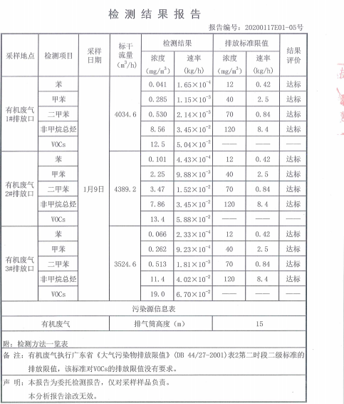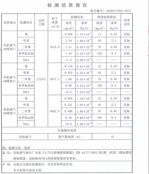(2)排放方式及排放口:公司共6個(gè)廢氣排放口,廢氣經(jīng)吸氣罩、風(fēng)管、活性炭水噴淋、UV光解機(jī)處理設(shè)施處理達(dá)標(biāo)后高空排放。