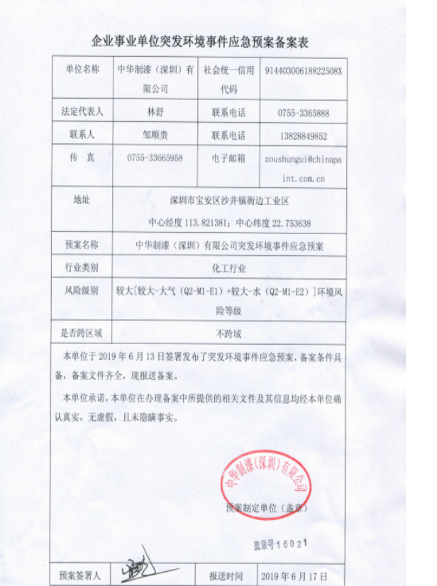 中華制漆(深圳)有限公司于1991年設(shè)立,統(tǒng)一社會(huì)信用代碼91440300618822508X,法定代表人林舒,企業(yè)聯(lián)系電話0755-33658888。工廠位于深圳市寶安區(qū)沙井鎮(zhèn)衙邊工業(yè)區(qū),占地面積58,000㎡,于1993年底建成全面投產(chǎn)。產(chǎn)品包括各類優(yōu)質(zhì)建筑涂料、保養(yǎng)性涂料、地板涂料、木器涂料及玩具涂料等,屬于危險(xiǎn)化學(xué)品企業(yè)。現(xiàn)有員工402人,其中安全管理人員、工程技術(shù)人員、行政管理人員180余人。