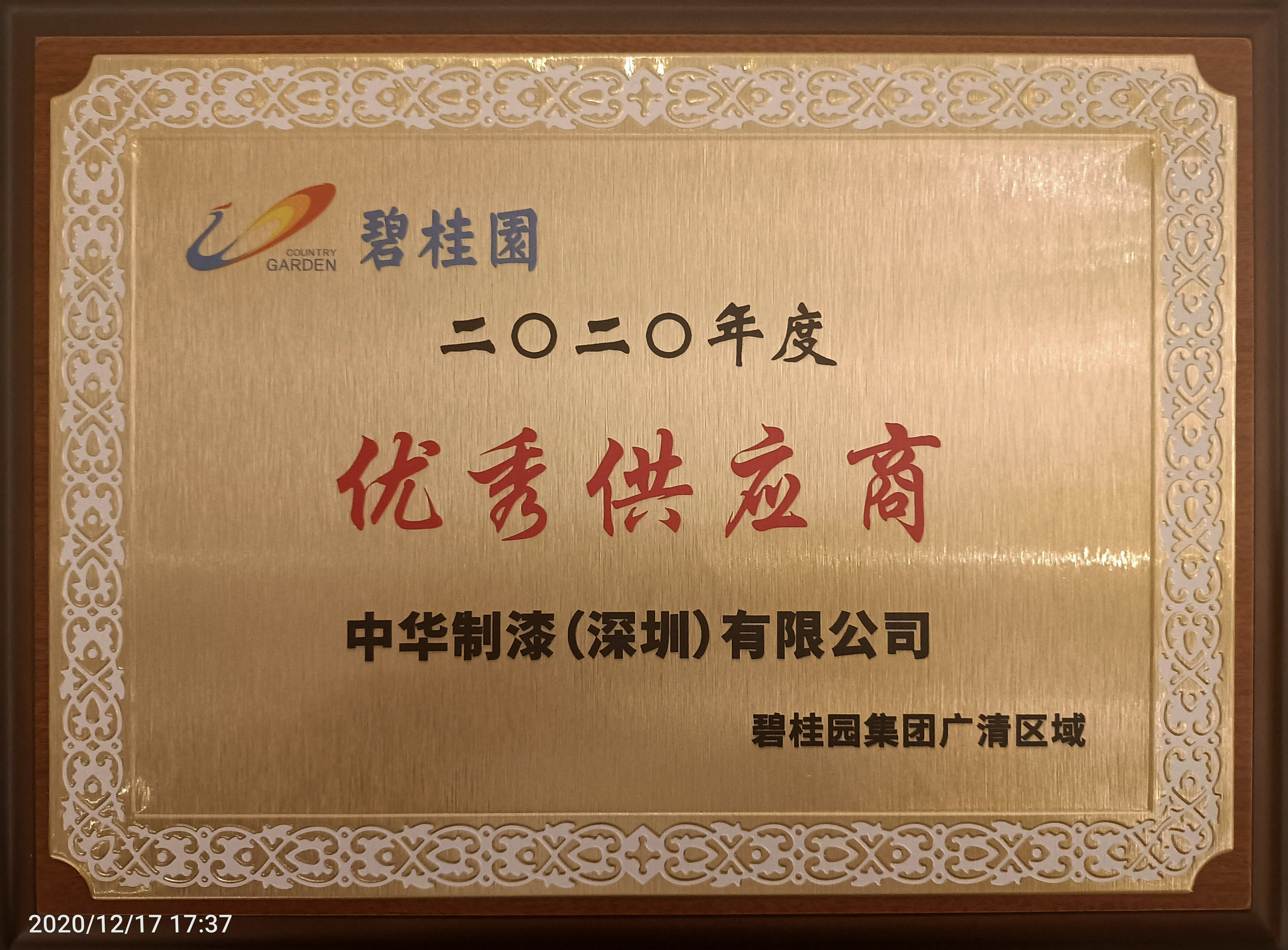 碧桂園集團?廣清區(qū)域在增城隆重舉行“同心同德?共創(chuàng)共贏”2020年供應(yīng)商答謝會。會上碧桂園集團充分肯定了中華制漆與碧桂園合作以來所做出的成績,同時對中華制漆實力、質(zhì)量安全管控、服務(wù)體系給予了高度認可,并授予中華制漆為“碧桂園2020年度優(yōu)秀供應(yīng)商”榮譽稱號。