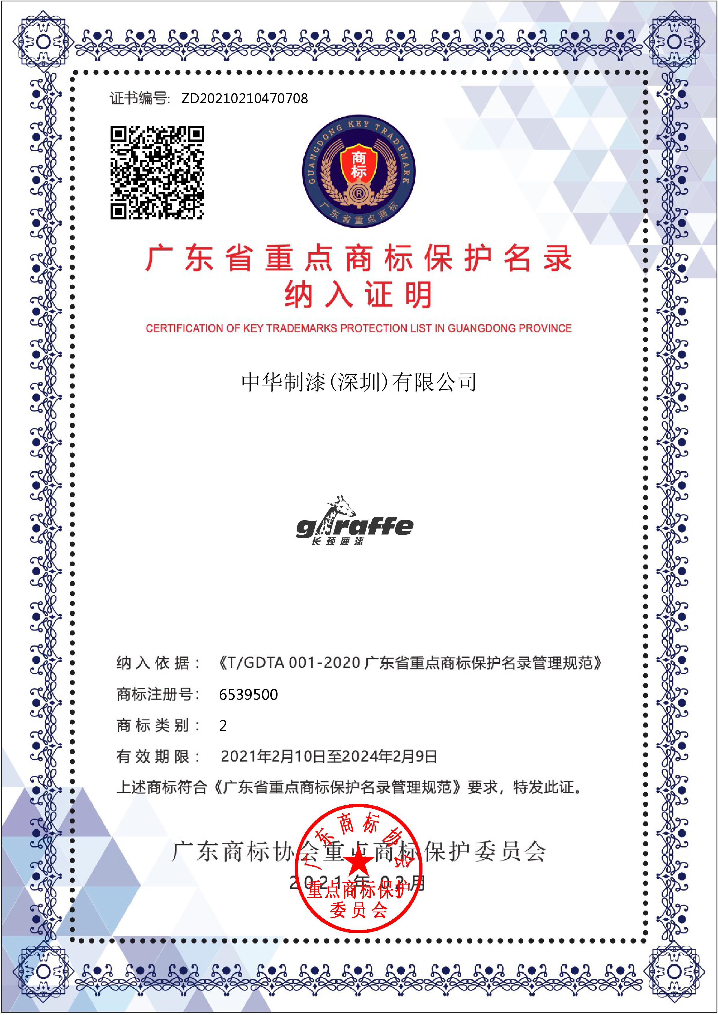 商標是企業(yè)品牌及產(chǎn)品服務通過相關制度獲得法律保護的重要標志,此次“長頸鹿漆”商標入選廣東省重點商標保護名錄,不僅體現(xiàn)了相關政府單位、商標協(xié)會單位對長頸鹿漆品牌及產(chǎn)品服務的高度認可和肯定,也展示了中華制漆對長頸鹿漆品牌建設發(fā)展的戰(zhàn)略管理與保護意識。